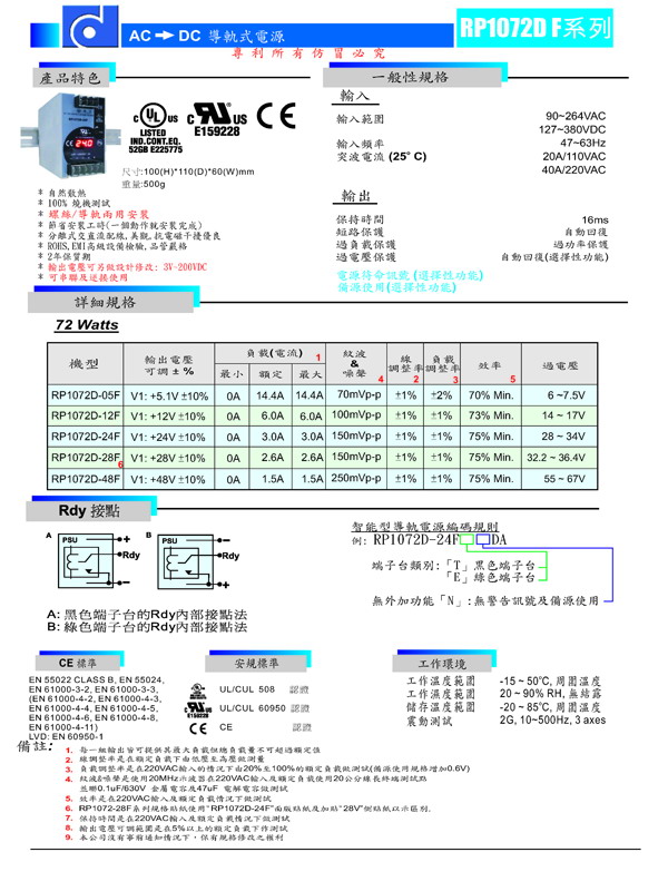 RP1072D-12F 12V6A 72W数显导轨电源性能参数