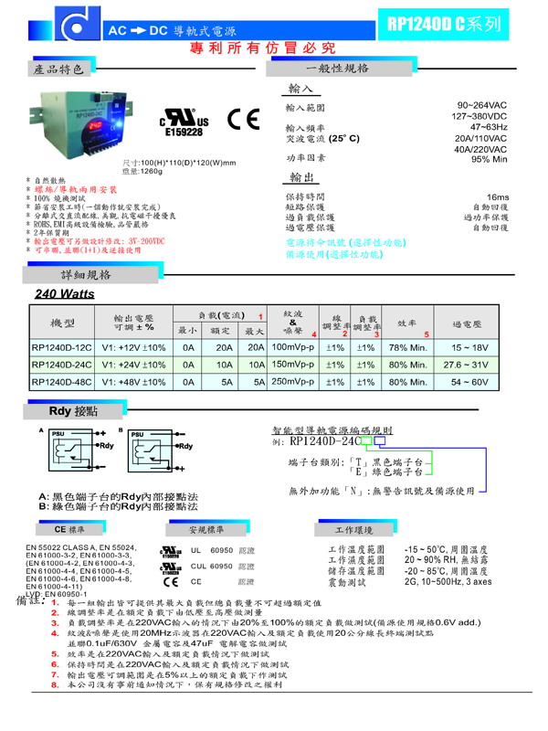 RP1240D-24C 24V10A 240W数显导轨电源性能参数