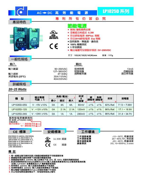 LP1025D-24S,24V1A 25W导轨式开关电源性能参数