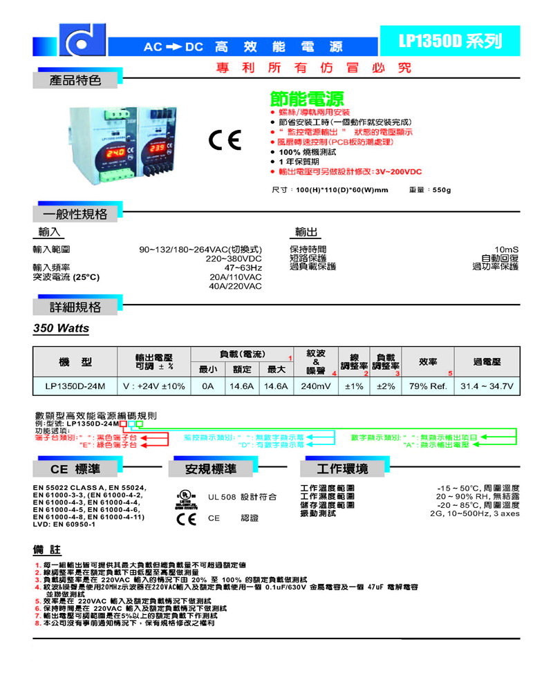 LP1350D-24MDA,24V14.5A 350W数显导轨式开关电源性能参数