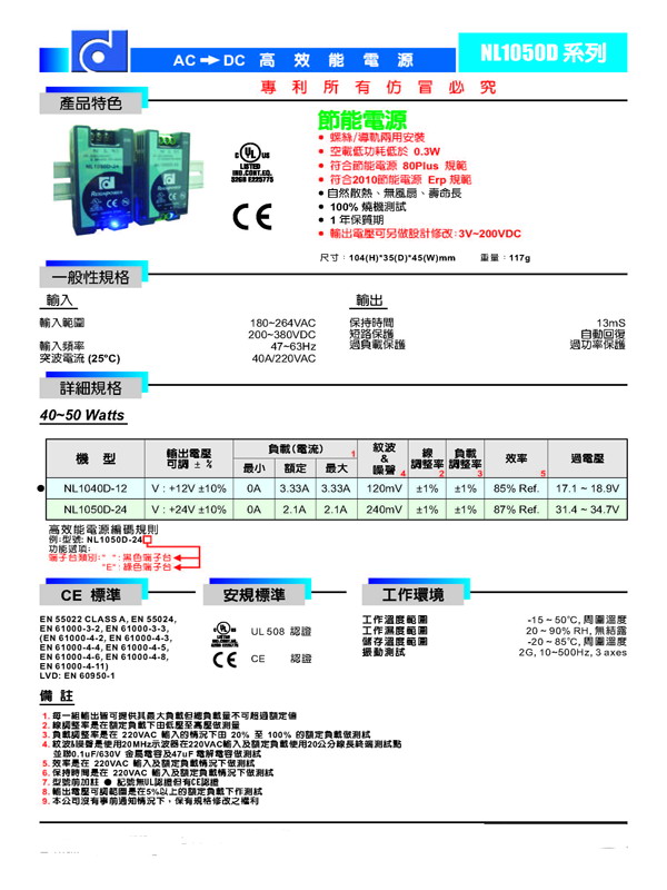 NL1050D-24,24V2.1A 50W导轨式开关电源性能参数